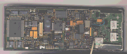 Backside of the display (28K) The ROM is the chip on the bottom right side. Its left side is next to the three verticel bands. The area to the left is where the keypad makes contact. The LCD is the blue rectangle on the top and the backlight is white and on the right.